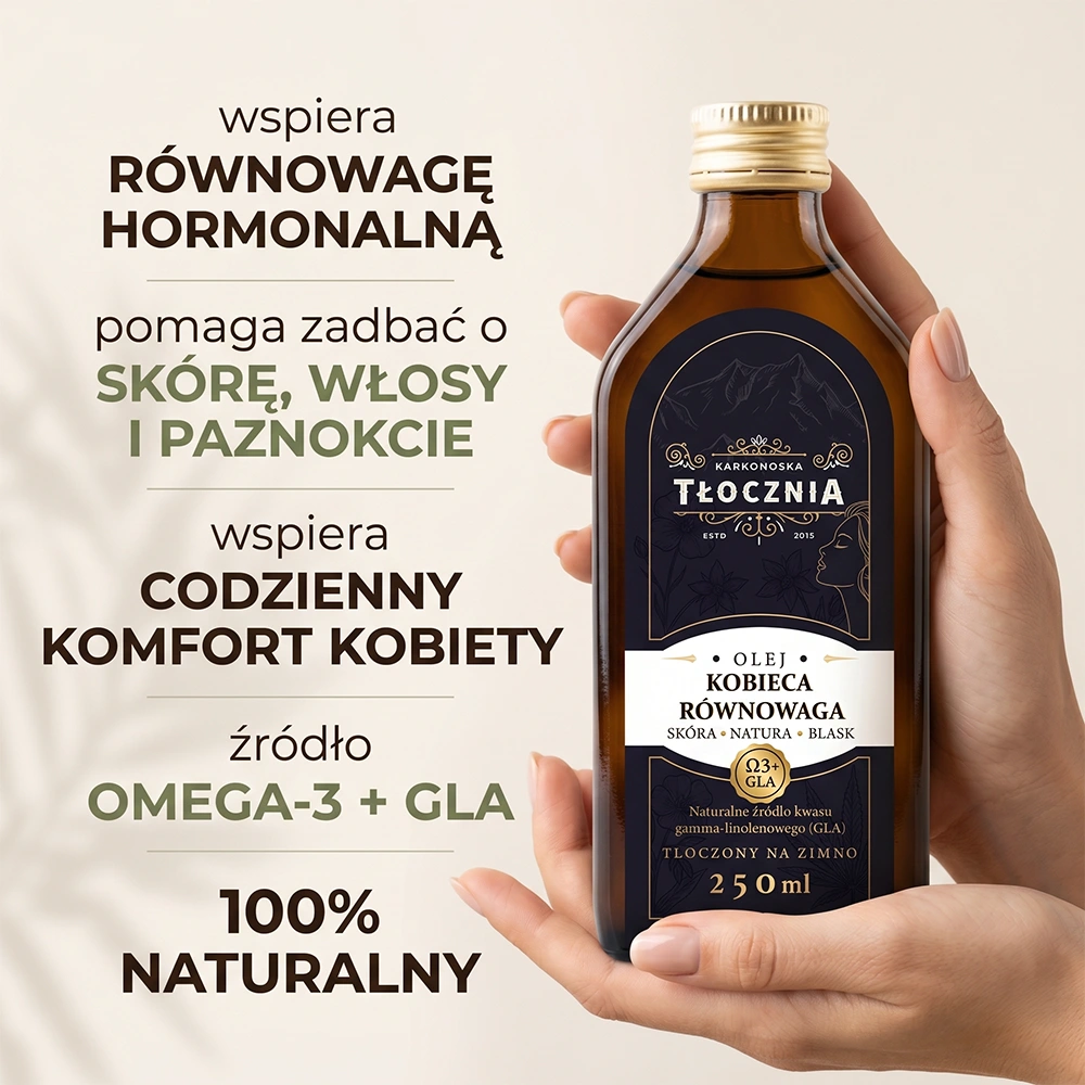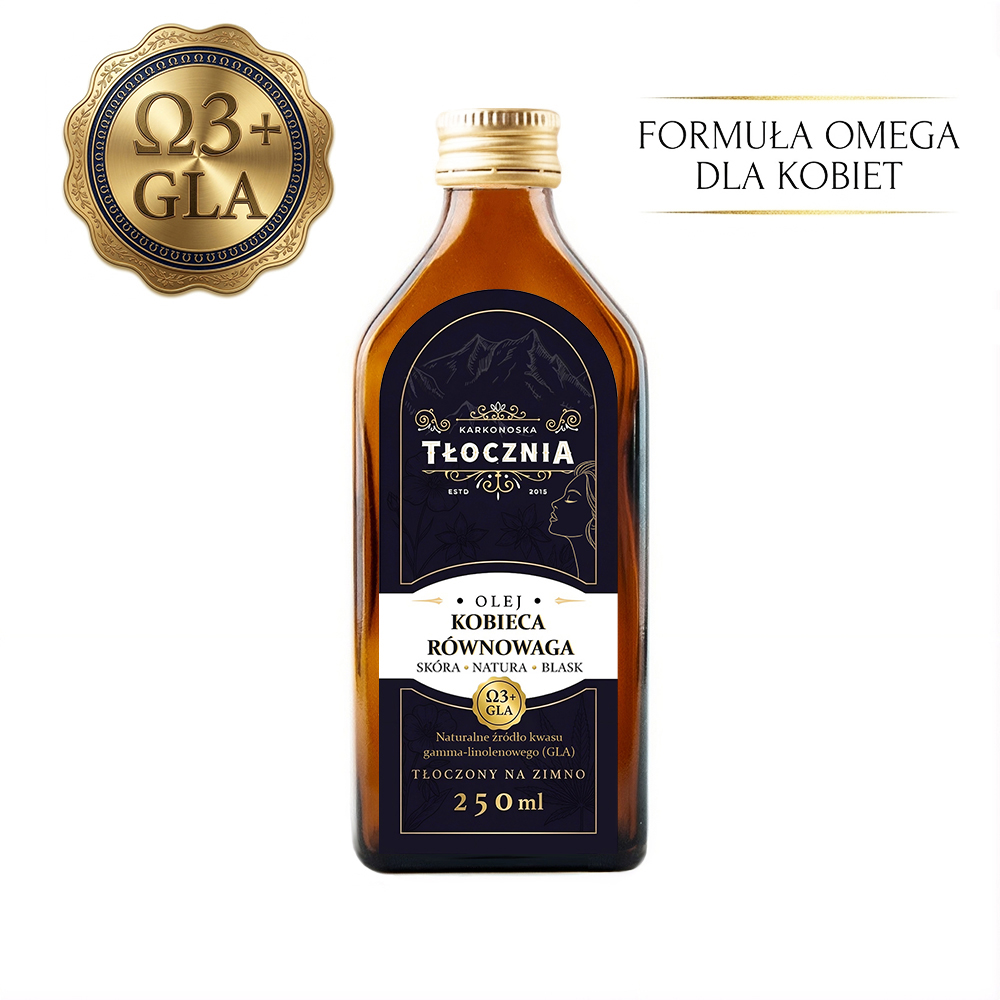 Naturalne oleje tłoczone na zimno od lat zajmują ważne miejsce w dietetyce kobiet. Starannie dobrana kompozycja oleju lnianego, konopnego, z wiesiołka oraz ogórecznika dostarcza cennych kwasów tłuszczowych omega-3 oraz kwasu gamma-linolenowego (GLA), które wspierają naturalną równowagę organizmu kobiety.