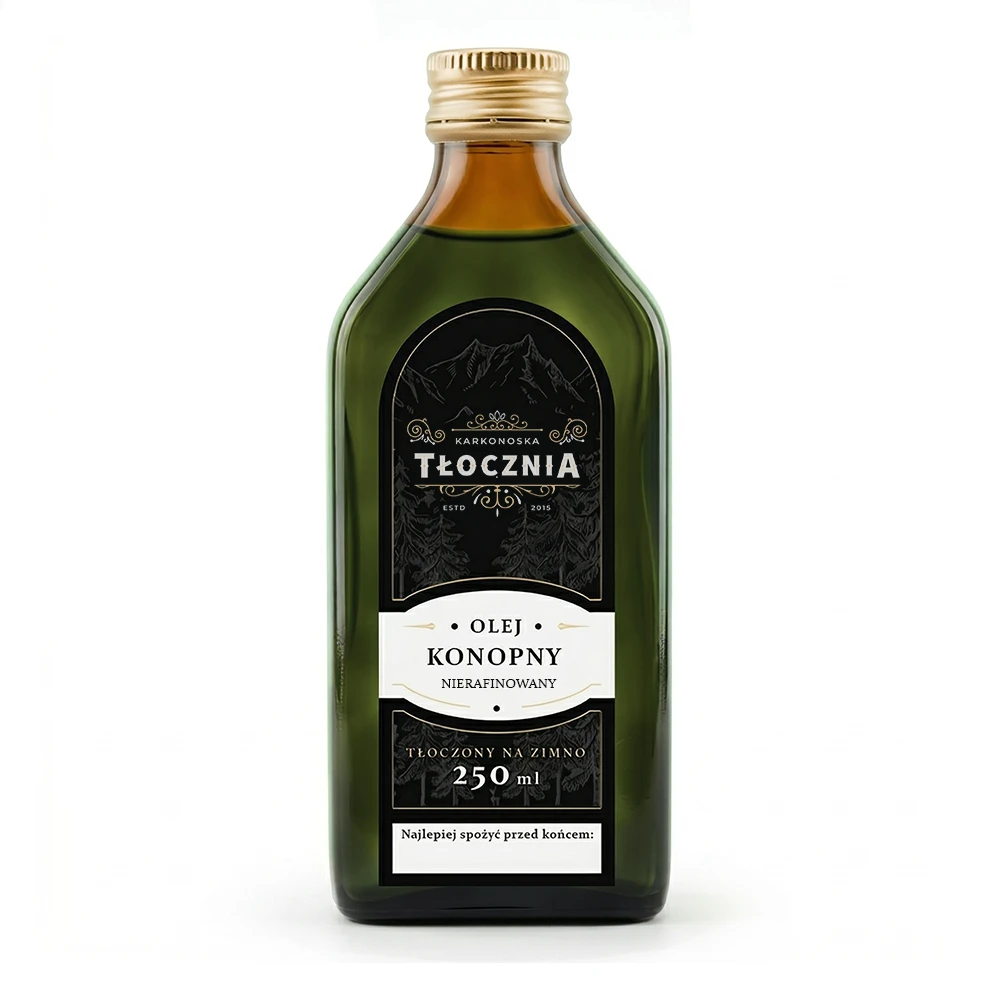 Olej konopny tłoczony na zimno z Karkonoskiej Tłoczni – czysta natura w butelce, która wspiera zdrowie, urodę i codzienną równowagę.