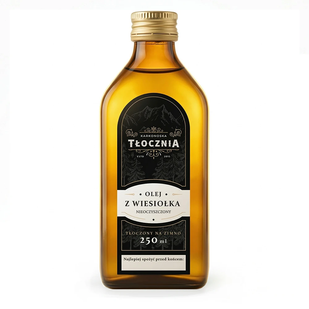 Olej z wiesiołka tłoczony na zimno z Karkonoskiej Tłoczni to produkt klasy premium, wytwarzany z najwyższej jakości nasion wiesiołka. Tłoczony w niskiej temperaturze, bez rafinacji i filtracji, zachowuje wszystkie naturalne składniki odżywcze, w tym cenne kwasy tłuszczowe omega-6 i gamma-linolenowy (GLA). To właśnie one sprawiają, że olej z wiesiołka jest tak wyjątkowy – wspiera odporność, zdrowie skóry oraz gospodarkę hormonalną, szczególnie u kobiet.