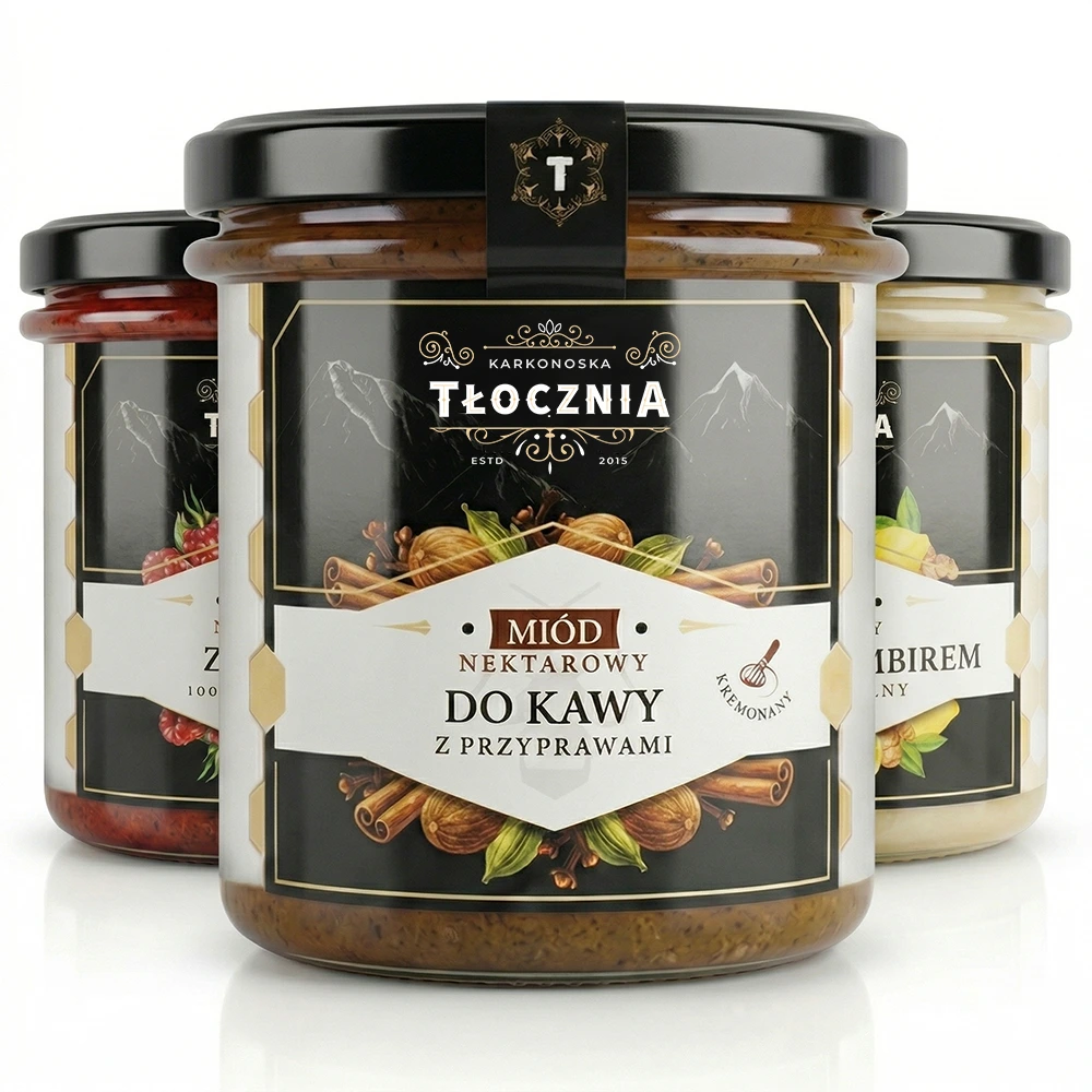 - Miód do kawy z przyprawami korzennymi – cynamon, kardamon, goździki i gałka muszkatołowa w naturalnym miodzie wielokwiatowym. To idealny dodatek do kawy, który zmienia poranek w aromatyczny rytuał.